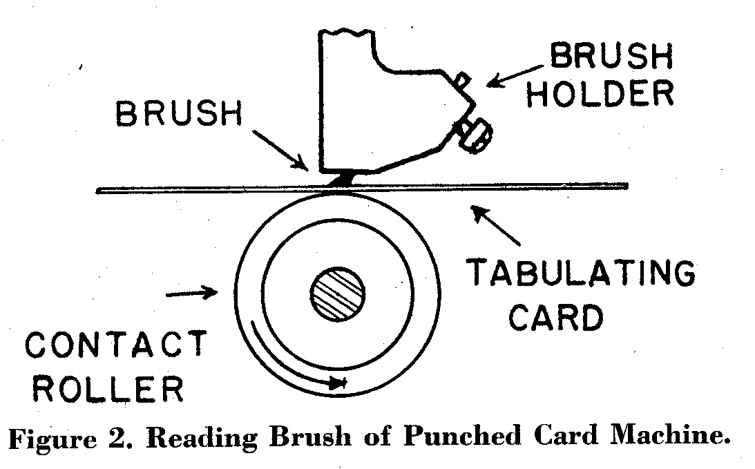 সব মেশিনে কার্ড পড়া নীতি একই। গর্ত কার্ড মধ্যে পাঞ্চ এবং গর্ত মাধ্যমে তৈরি বৈদ্যুতিক যোগাযোগের মাধ্যমে পড়তে হয়। কার্ড, একটি অন্তরক হিসাবে অভিনয়, একটি টেলিগ্রাম বুরুশ এবং একটি ব্রাস রোলার মধ্যে পাস (ডুমুর দেখুন। 2)।